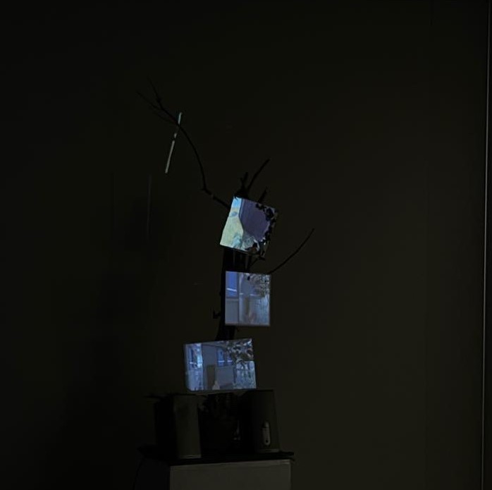 The focal point of the installation was a makeshift tree constructed from found leaves and sticks. The sculpture drew inspiration from the Norse myth of Yggdrasil, the world tree that holds the nine realms—similarly, my tree held all of these imagined "worlds." To display these environments, I used foam board as windows through which to project the simulations.